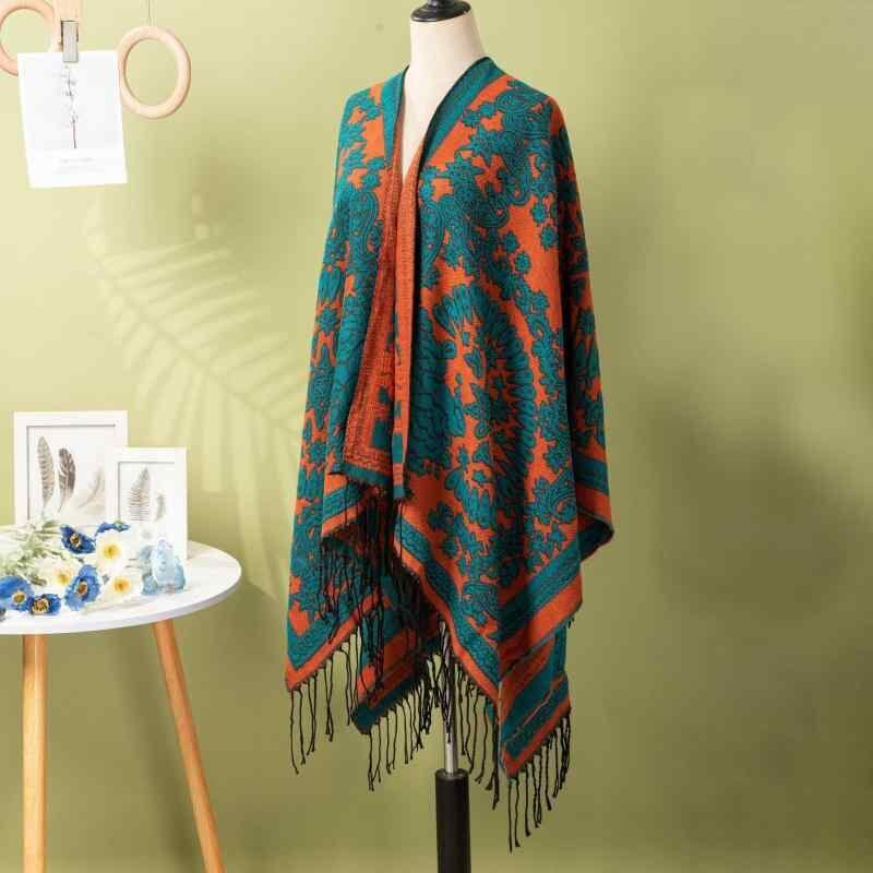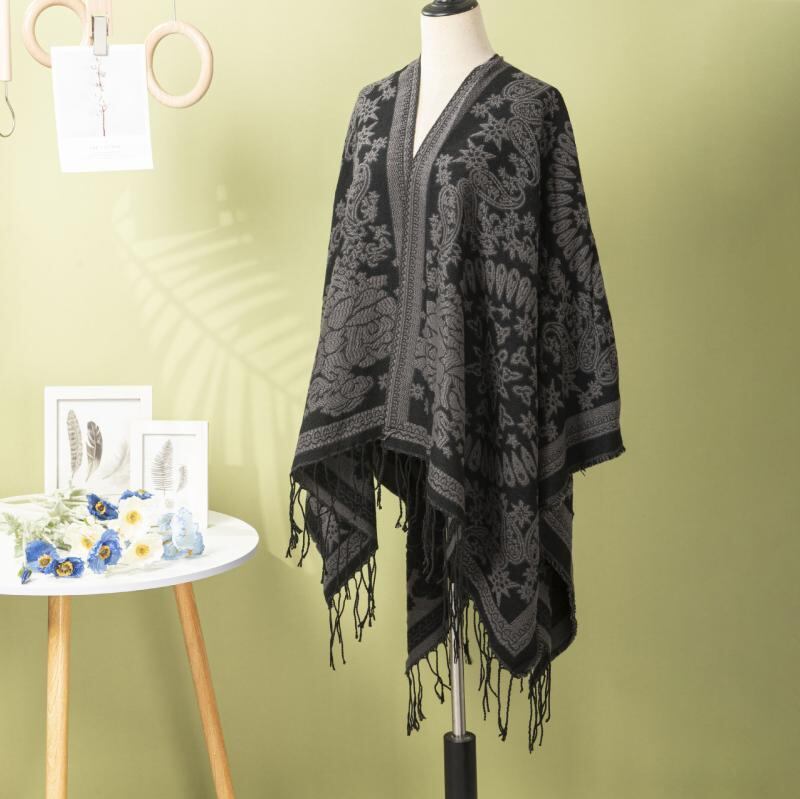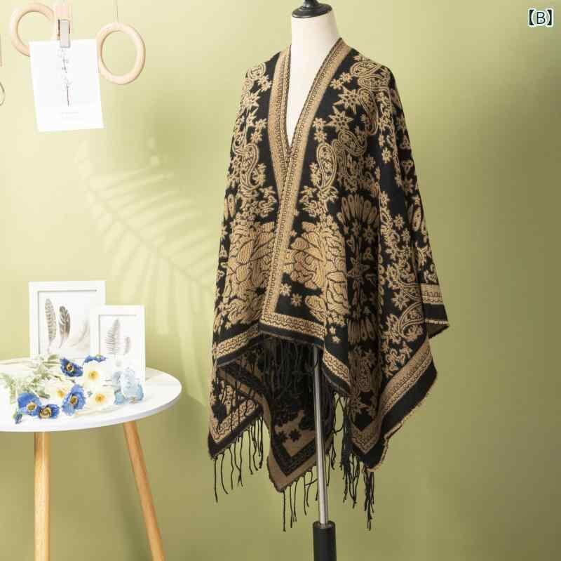 ショール レディース 防寒 保温 古代武器 線画柄 ブロンズカラー ポンチョ ケープ 旅行 写真 民族風 レトロ フリンジ 羽織り ポリエステル アクリル