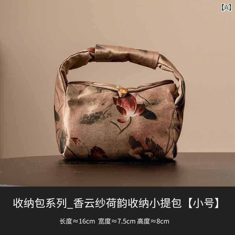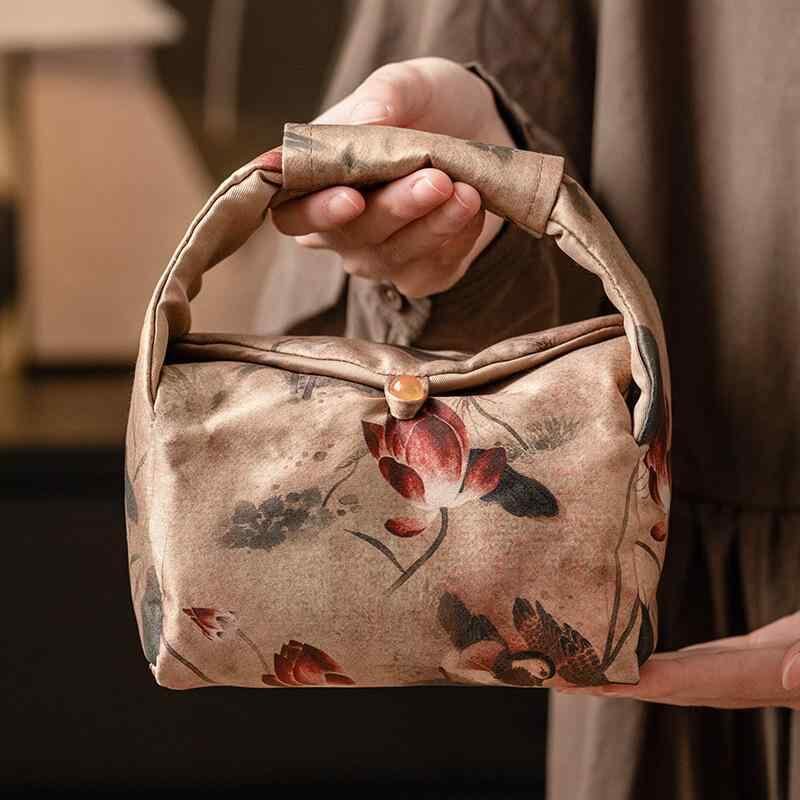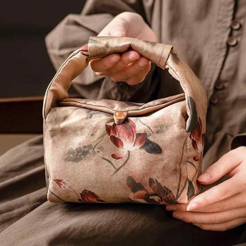 茶器収納バッグ 香雲紗 織錦 蓮の風情 高級感 大容量 ポータブル 携帯用 ミニトート 手提げ アウトドア キャンプ 車載 旅行用 ピクニック
