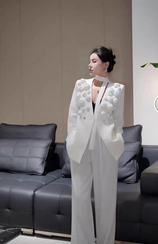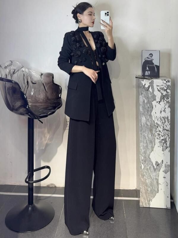 セットアップ レディース 知的エレガント テーラードジャケット ワイドパンツ 2点セット 春夏 フォーマル 通勤 オフィス 立体フラワー 花モチーフ ハンドメイドデザイン 上品 ポリエステル オフホワイト ブラック