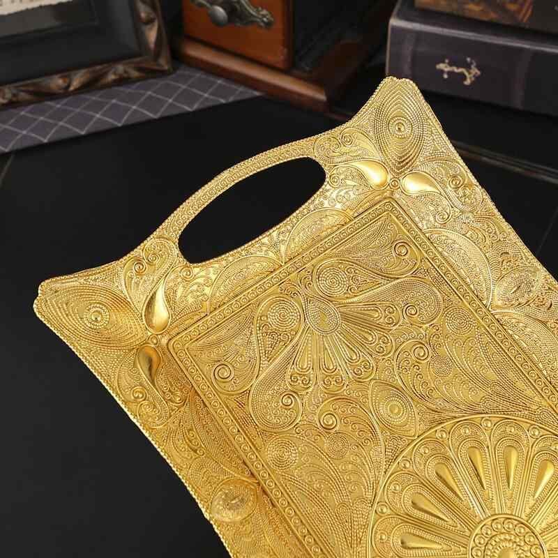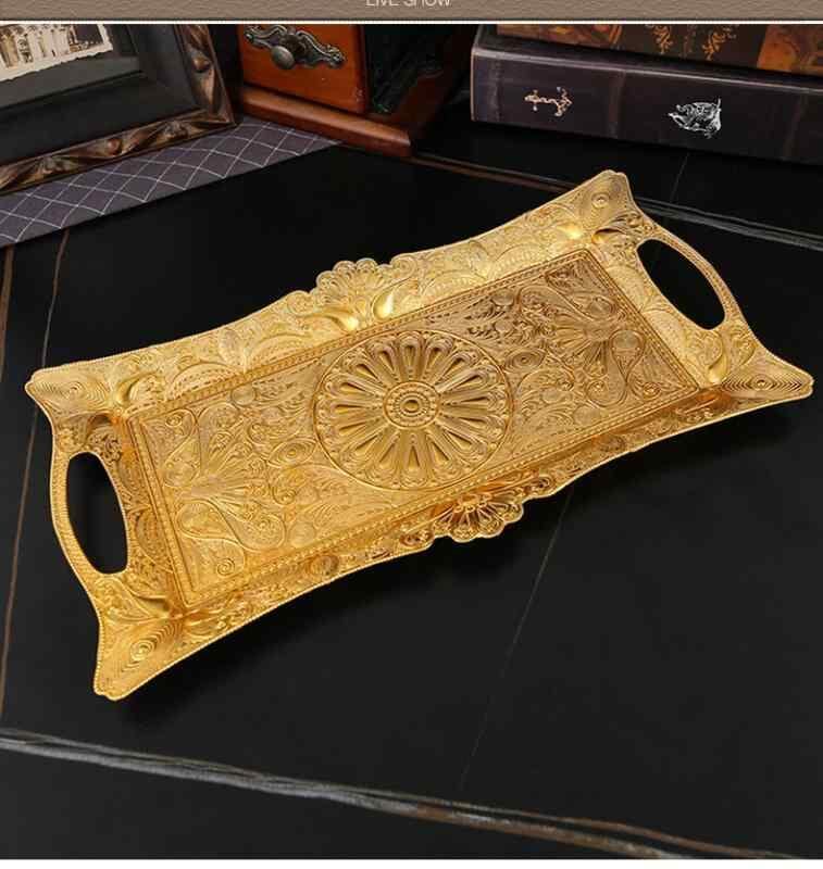 お盆 金属製 長方形 ゴールド 孔雀柄 宮廷風 欧風 ライトラグジュアリー レトロ調 高級感 エレガント 持ち手付き フラット 業務用 ディスプレイ インテリア 盛り皿