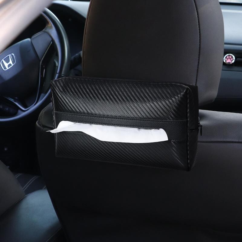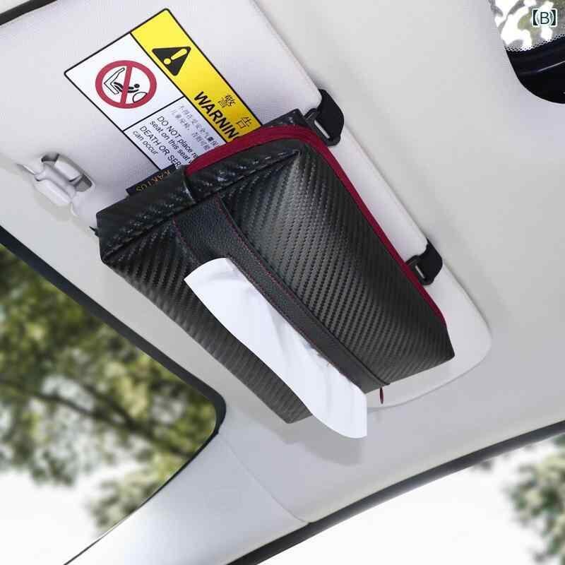ティッシュケース 車載 カーボンファイバー柄 レザー 高級感 吊り下げ式 ロングタイプ ビジネス オフィス サンバイザー 後部座席 ドライブ 薄型 スリム 収納 ブラック シルバー グレー レッド