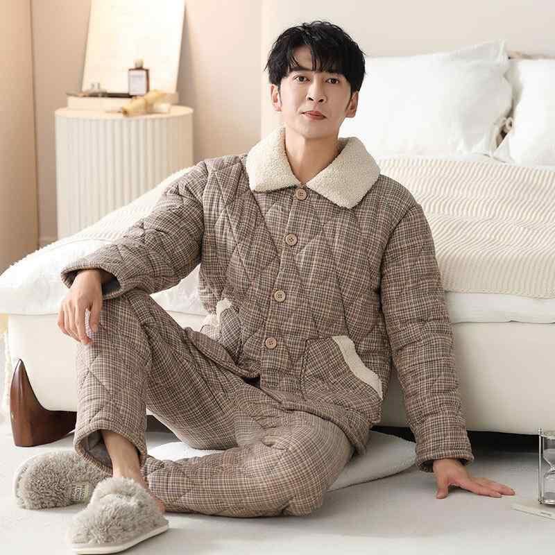 パジャマ メンズ 男性用 秋冬 3層構造 極厚 裏ボア 中綿入り キルティング 綿織物 サンゴフリース 襟付き 前開き 長袖 長ズボン 上下セット 保温 防寒 快適 通気性 ルームウェア 部屋着 外出着 アウトドア カジュアル