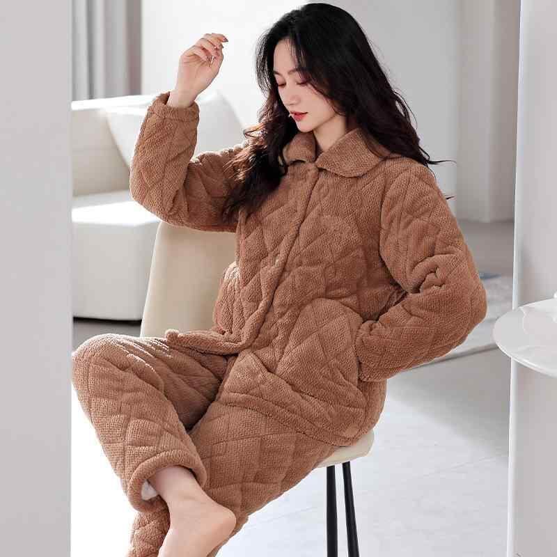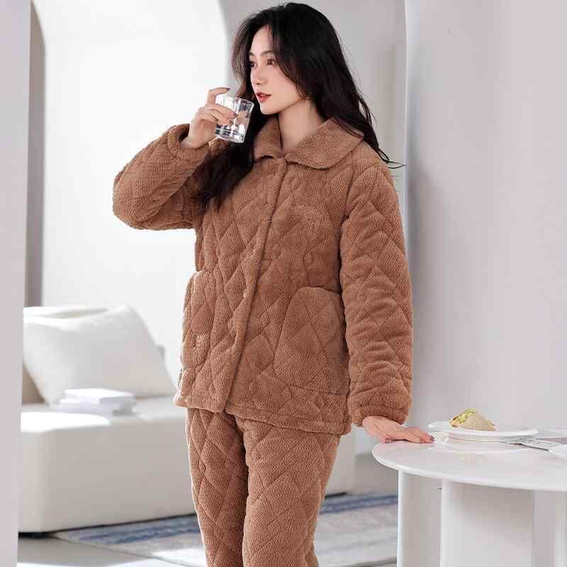 パジャマ レディース 女性用 冬 三層キルティング サンゴフリース 裏起毛 極厚 あったか 保温 ふわふわ もこもこ ルームウェア 部屋着 寝巻き 上下セット 長袖 長ズボン 開襟 襟付き