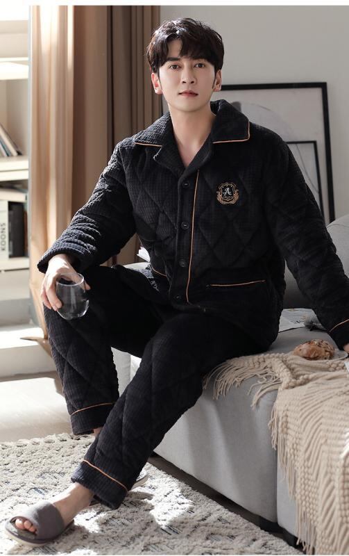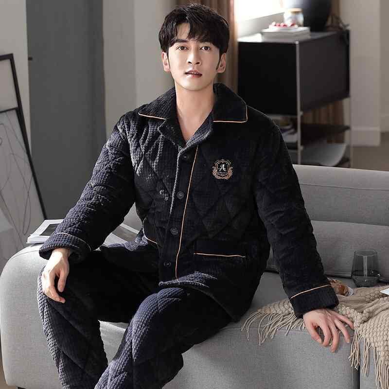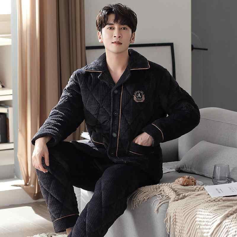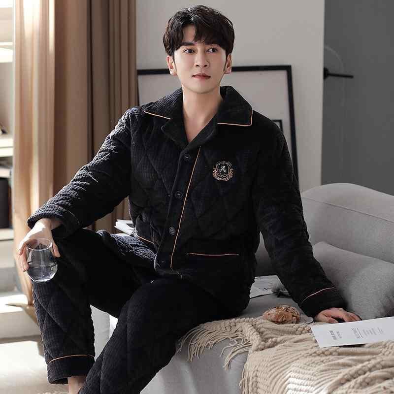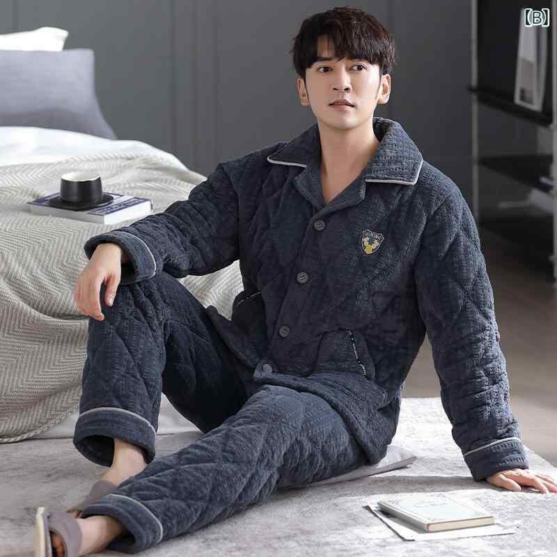 パジャマ メンズ 男性用 秋冬 三層構造 極厚 中綿入り 極暖 保温 防寒 前開き 襟付き 長袖 長ズボン サンゴフリース ルームウェア 上下セット