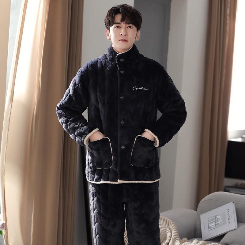 ["・カテゴリ: セットアップ","・生地: サンゴフリース中綿入り","・デザイン: カーディガン","・主な素材: ポリエステル95%以上","・厚さ: 厚手","・生地厚さ: 超厚手","・ネックライン: スタンドカラー","・袖丈: 長袖","・パンツ丈: ロング","・機能: リラックス、通気性、睡眠、部屋着、保温、快適、普段着","・対象: 青年男性","・適用シーン: アウトドア、部屋着","・カラー展開: チャコールブラック、ロックグレー、グリグレー、クラシックブラック","・サイズ展開: L、XL、XXL、XXXL","・スタイル: シンプルカジュアル"]