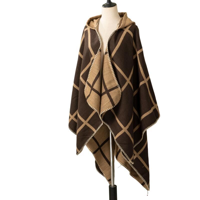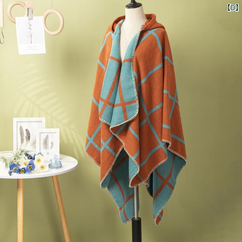ポンチョ レディース 秋冬 ストライプ ブロック チェック 幾何学模様 フード付き 保温 防風 厚手 ケープ ショール レトロ エスニック 上品 エレガント ポリエステル アクリル混紡