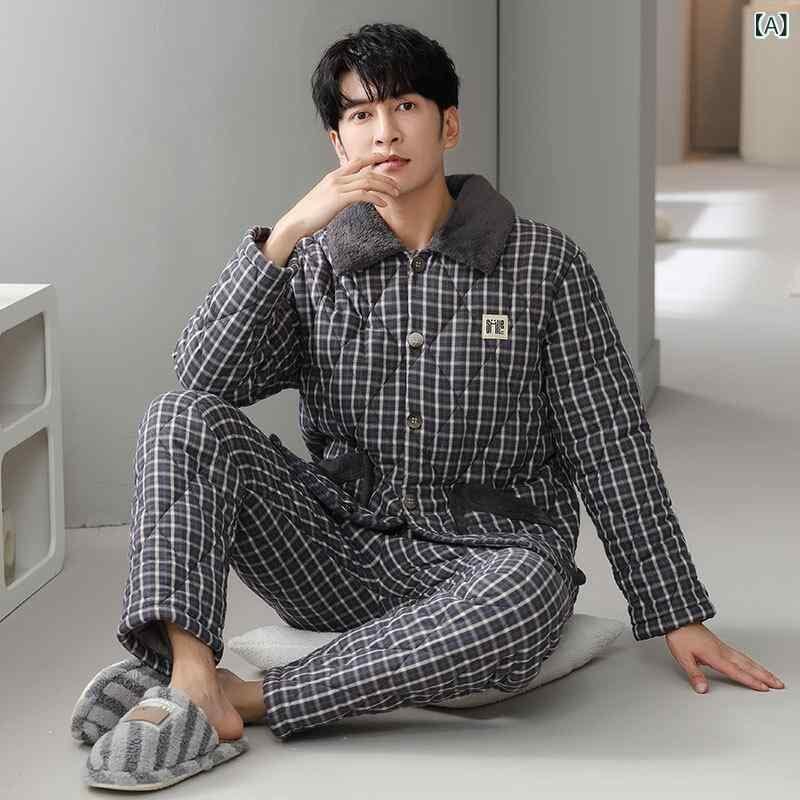 パジャマ 男性用 秋冬 3層構造 裏起毛 サンゴフリース 中綿入り 綿100% 織物 極厚 保温 あったか 前開き 襟付き 長袖長ズボン 上下セット ルームウェア 部屋着 防寒 快適