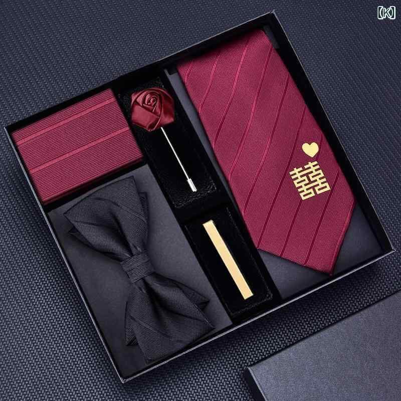 ネクタイ 男性用 5点セット 結婚式 ウェディング 新郎 フォーマル 披露宴 二次会 ワンタッチ 結ばない ワインレッド ストライプ柄 ポリエステル 蝶ネクタイ ポケットチーフ タイピン ブートニエール