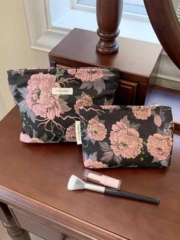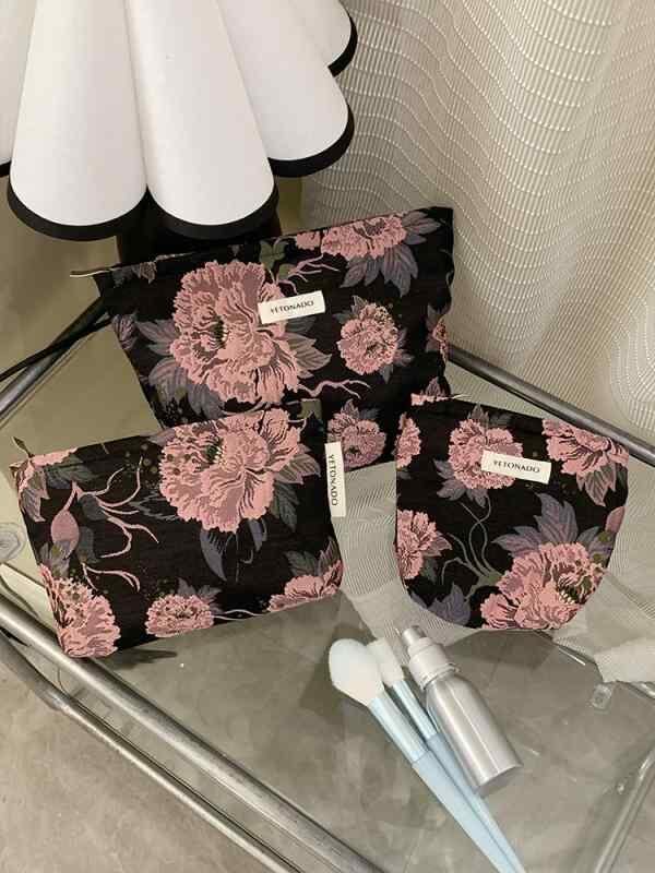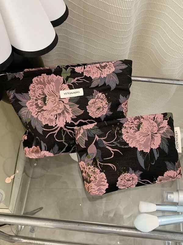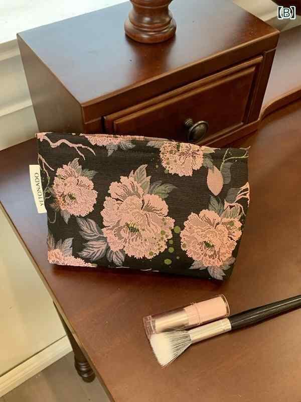 ポーチ レディース ジャカード織り 大容量 携帯用 ポータブル 収納 コスメ 化粧 ペンケース 筆箱 トラベル 洗面 クラッチ セカンド バッグインバッグ インナー ポリエステル 花柄 かわいい 黒 ピンク 日常使い