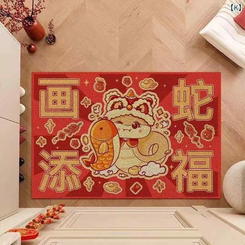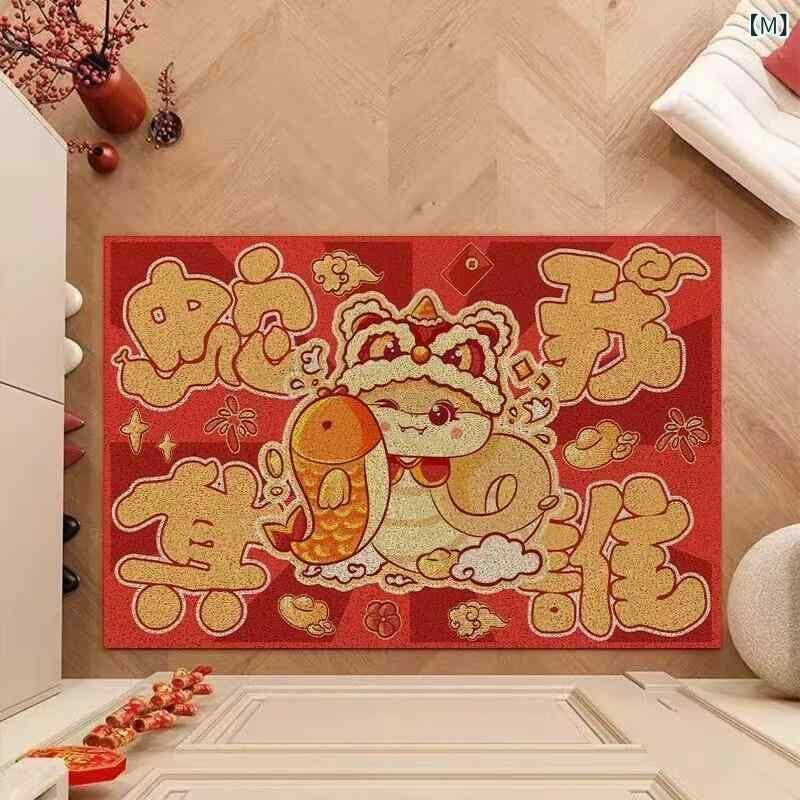 玄関マット 巳年 ヘビ柄 赤色 レッド かわいい 縁起物 PVC コイル 泥落とし 汚れ防止 丸洗い カット可能 エントランス用 長方形 フロアマット ドアマット 滑り止め