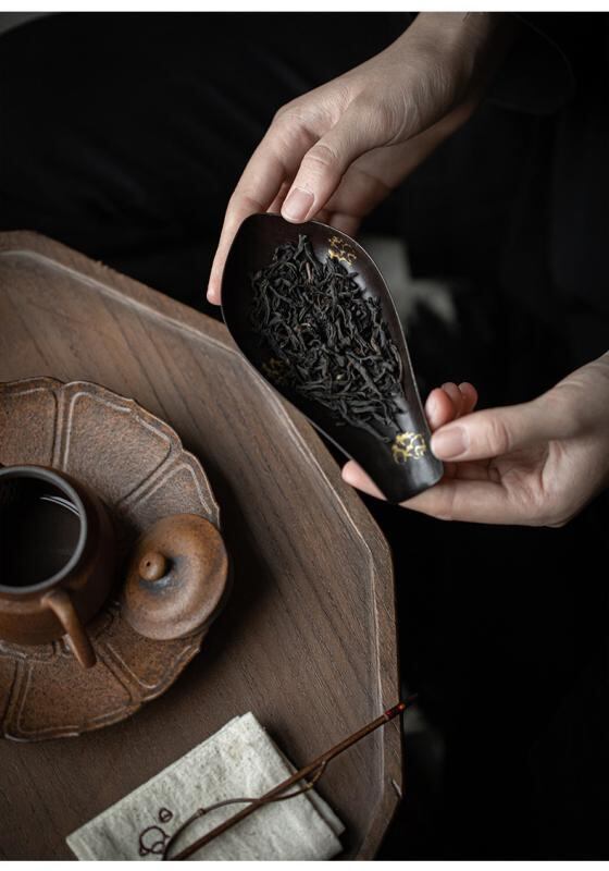 茶道具 茶器 手作り 金点 鉄製 古風 新中国風 半月型 蓮弁モチーフ 茶則 茶荷 茶匙 茶葉置き 茶道 六君子セット 趣のある 上品な 喫茶 鑑賞 お茶会 茶席 用品 コレクション インテリア
