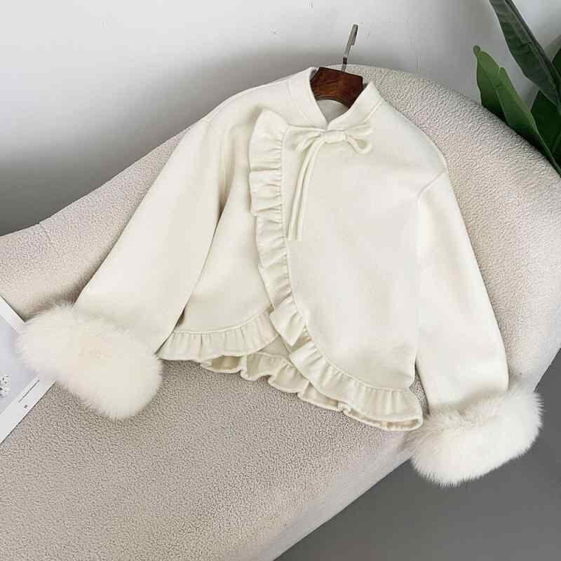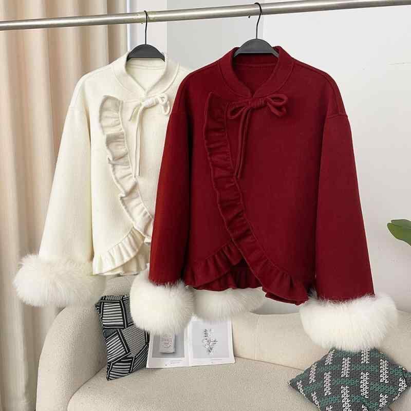 ウールコート レディース 秋冬 ダブルフェイス カシミヤ混 ショート丈 ウエストマーク フリル フォックスファー袖口 甘めカジュアル レッド アイボリー