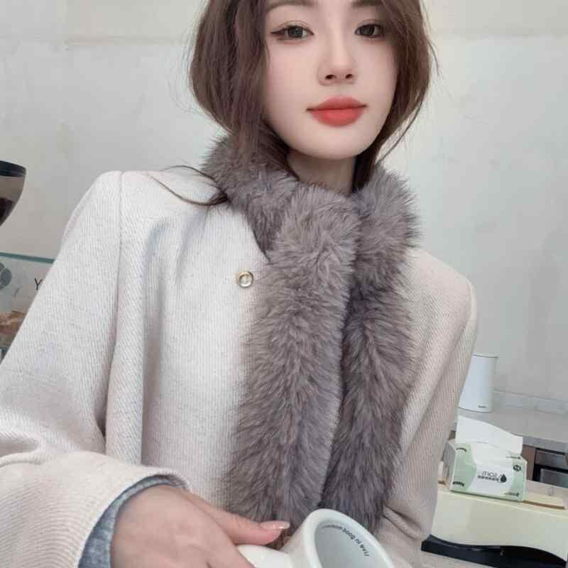 マフラー レディース 韓国風 クロスデザイン 差し込み フェイクファー ラビットファー調 ふわふわ もこもこ 厚手 防寒 あったか 学生向け カジュアル ストリート 無地 秋冬春 カフェオレ ブラウン系