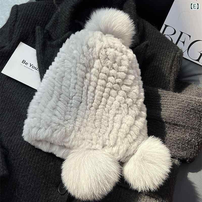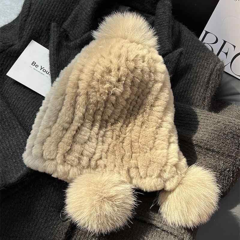 帽子 レディース リアル レッキスラビットファー フォックスファーポンポン ニット帽 ビーニー 肉厚 耳当て付き 防寒 あったか 秋冬 ベージュ系 ブラック