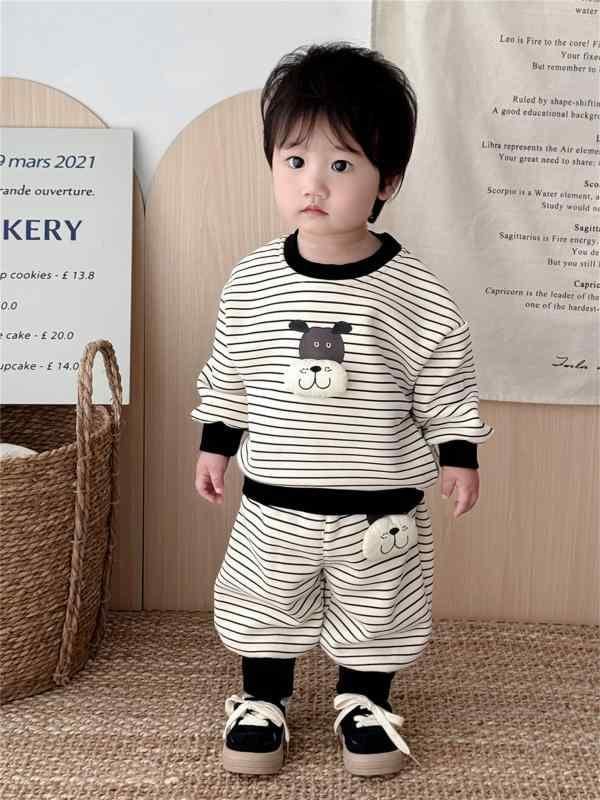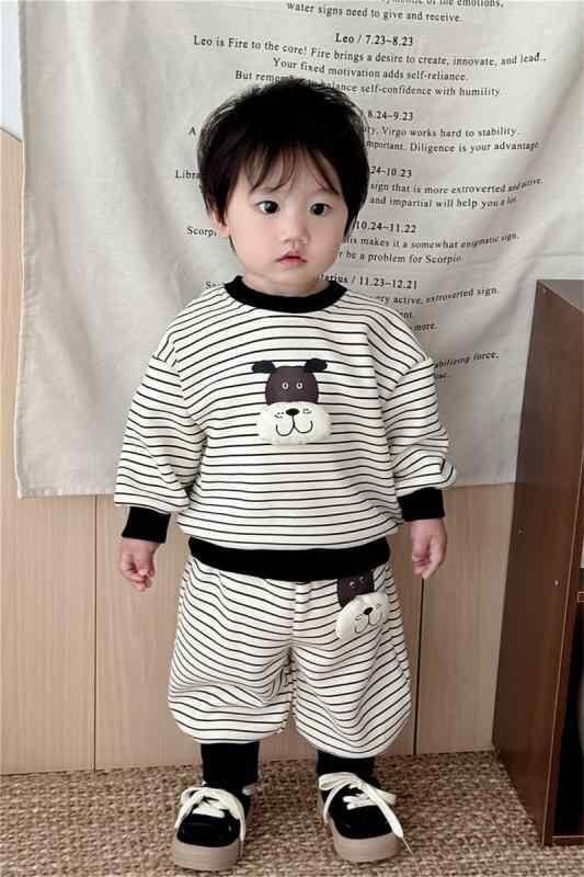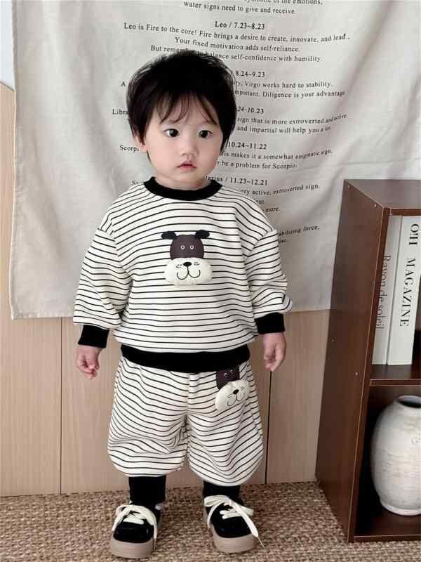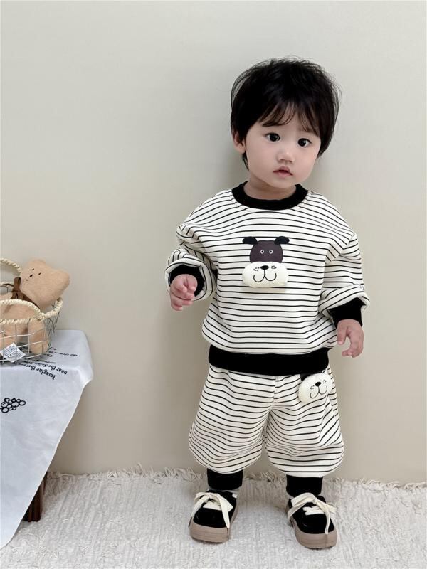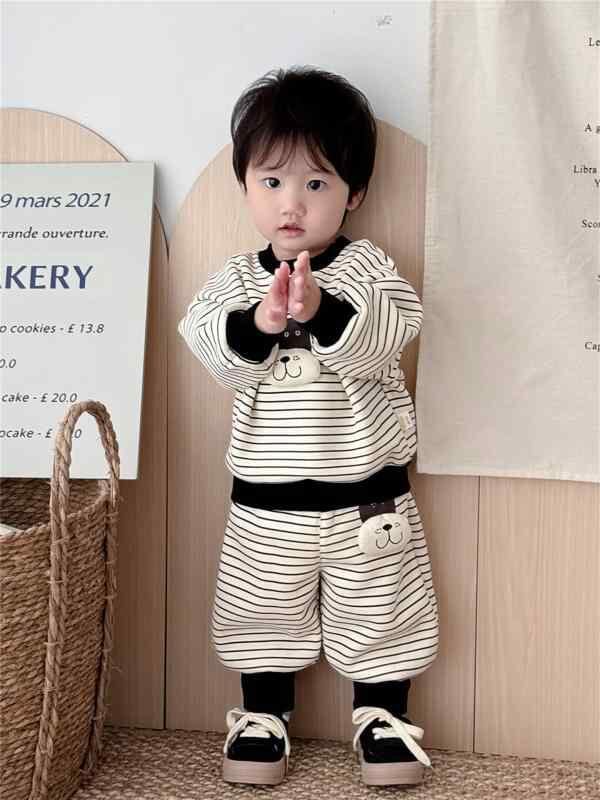 ベビー 男の子 冬服 裏起毛 スウェット トレーナー 上下セット コットン フリース 厚手 暖かい ストライプ柄 セットアップ 2点セット おしゃれ 普段着 お出かけ 秋冬