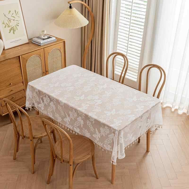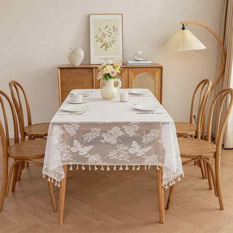 テーブルクロス レース フリンジ 高級感 上品 エレガント 長方形 ポリエステル製 ボタニカル柄 蝶々柄 白 モダン シンプル リビング ダイニング 食卓用 インテリア デコレーション
