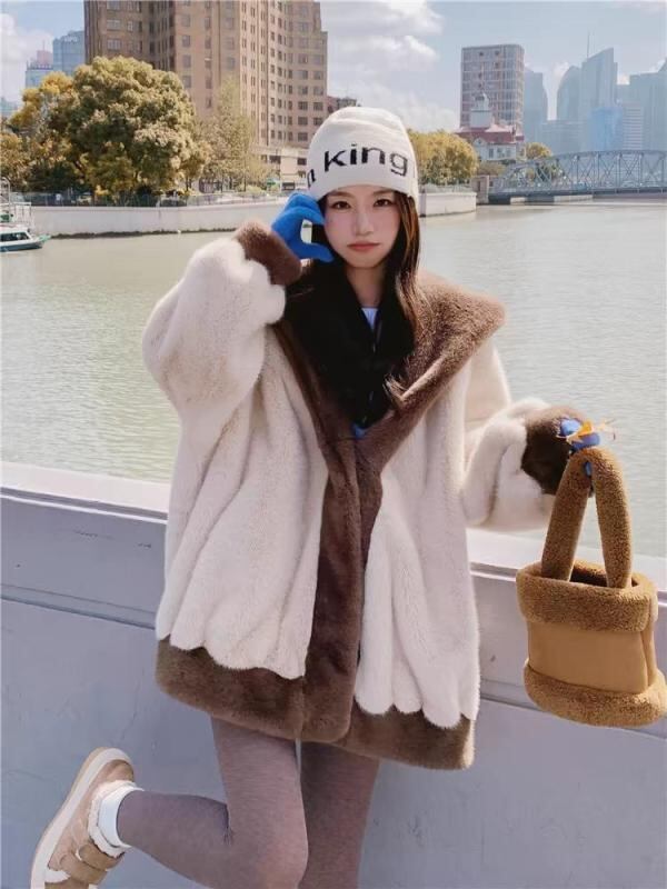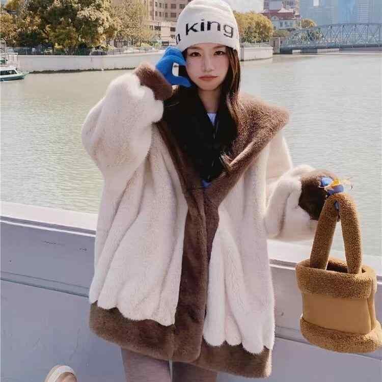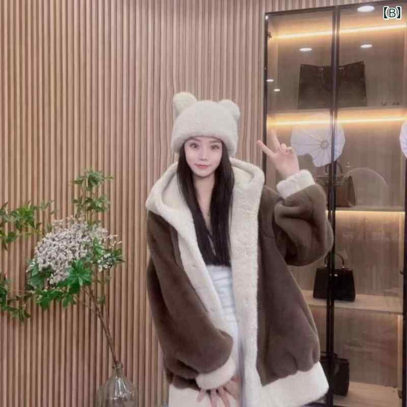 コート レディース フェイクファー アウター ミンク調 フード付き ミドル丈 ミディ丈 ゆったり ルーズフィット 厚手 秋冬 アクリル スエード調 韓国風 低身長 小柄向け 通勤 オフィス 上品 アイボリー ブラウン