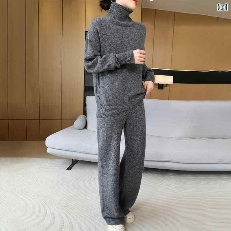 セットアップ レディース 秋冬 カジュアル ハイネック タートルネック 長袖 メランジニット ウール ゆったり ルーズフィット ロングパンツ 長ズボン ツーピース 2点セット 通勤 普段使い リラックスウェア パープル系 グレー