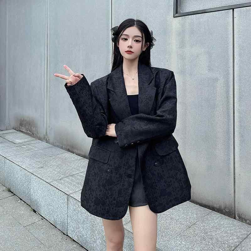 テーラードジャケット レディース ブラック ジャカード 高級感 ダブルブレスト ゆったり 長袖 ポリエステル 上品 エレガント 秋冬 きれいめ 通勤 オフィス ビジネス