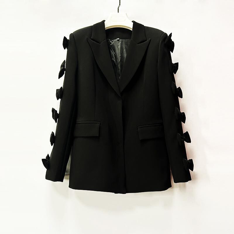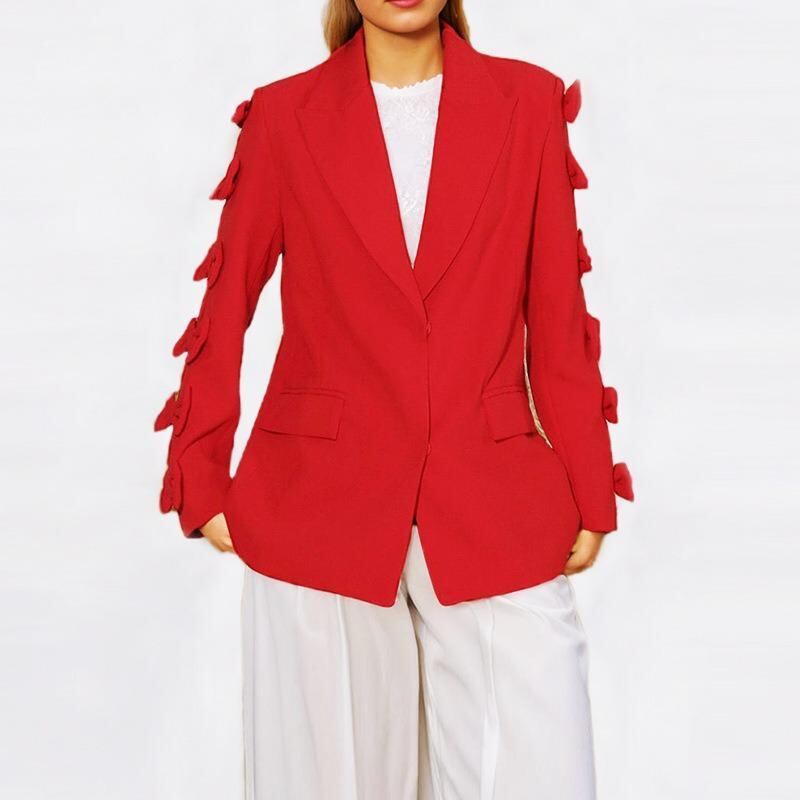 ジャケット レディース 高級感 欧米風 エレガント 上品 個性的 ゆったり ミドル丈 テーラードカラー 長袖 花びら袖 ダブルボタン 綿混紡 春夏 オフィス カジュアル リボンデザイン