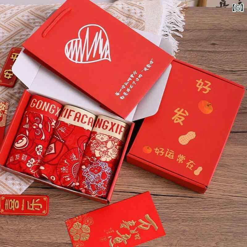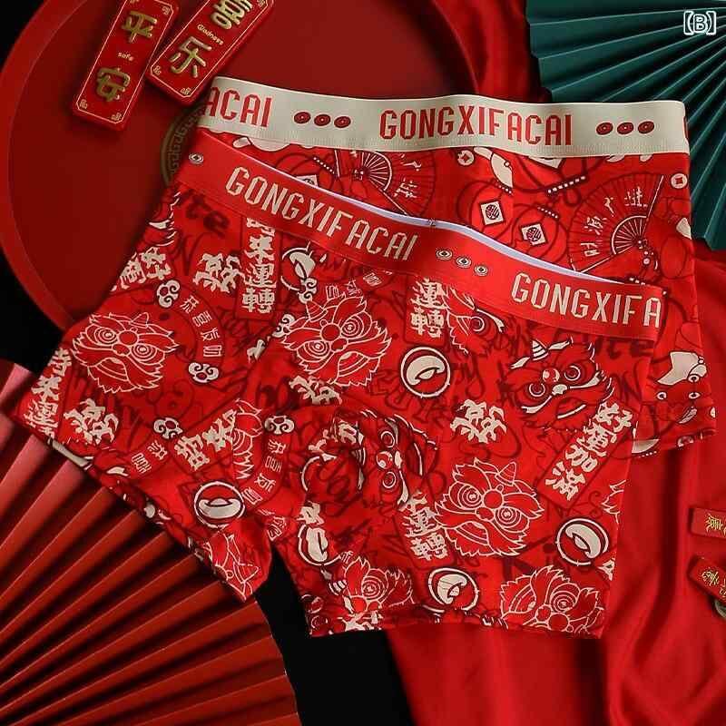 ボクサーパンツ メンズ 男性用 3枚組 綿100% コットン 新年 開運 レッド 結婚 縁起物 招き猫 プリント おしゃれ トレンド 抗菌 防臭 通気性 ミドルライズ シームレス アニマル柄 スムース