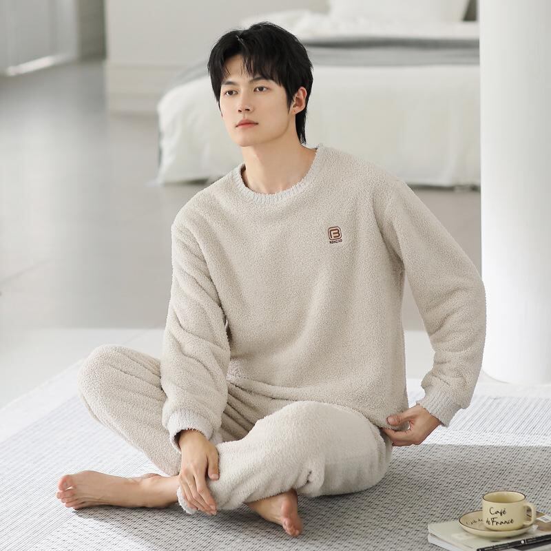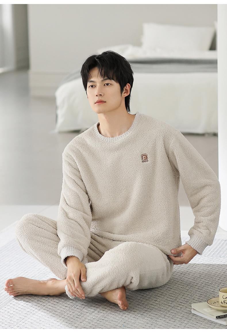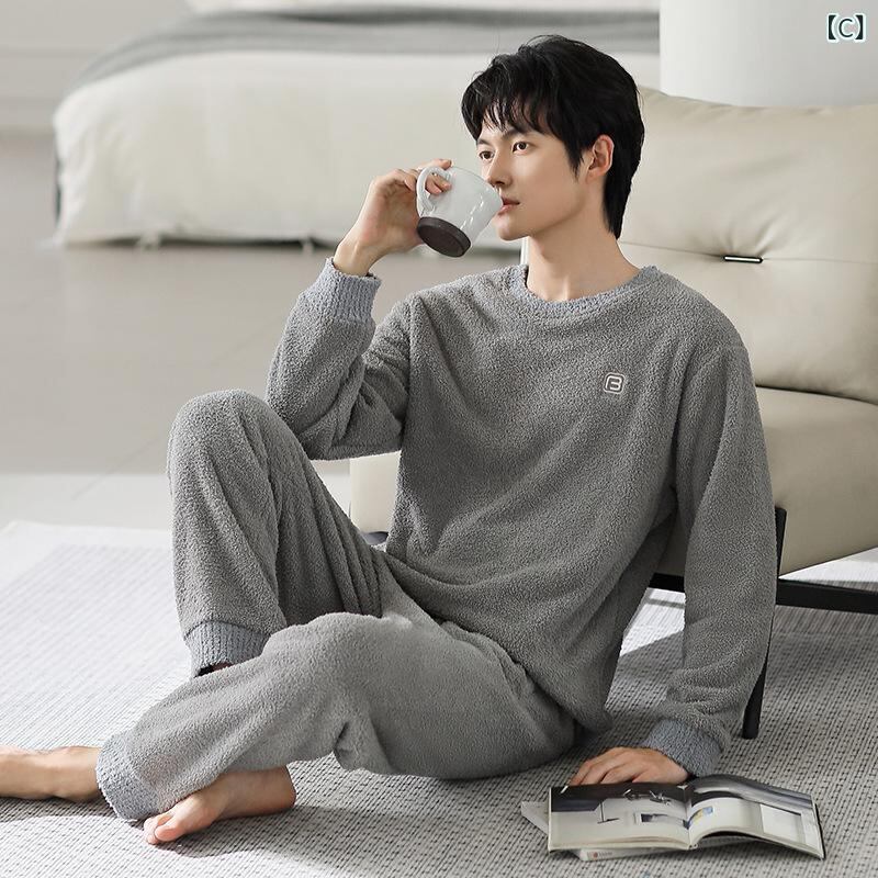 パジャマ メンズ 男性用 フリース サンゴマイヤー 厚手 裏起毛 保温 暖かい ルームウェア 部屋着 丸首 長袖 長ズボン 上下セット 秋冬