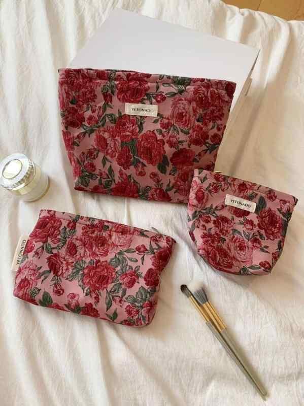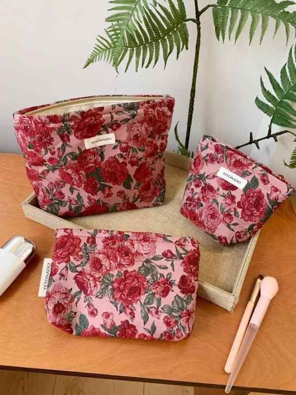 化粧ポーチ レディース レトロ花柄 ジャガード織り コスメポーチ ダークレッド スクエア型 ファスナー開閉 クラッチ 手持ち鞄 収納 デイリーユース