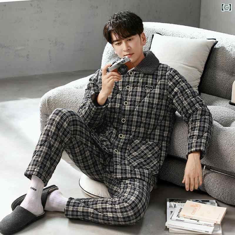 パジャマ メンズ 男性用 秋冬 綿100% コットン 織物 三層 厚手 中綿入り 裏起毛 保温 あったか 快適 通気性 ルームウェア 部屋着 外出可能 上下セット