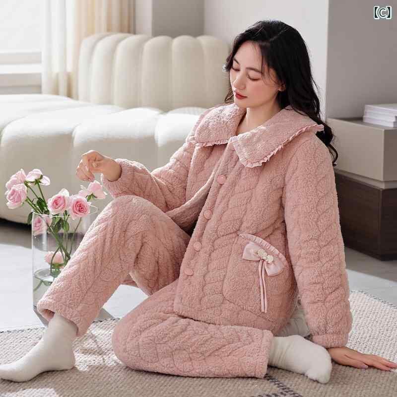 パジャマ レディース 女性用 秋冬 サンゴフリース フランネル 中綿入り キルティング 極厚 裏起毛 あったか 保温 長袖 ロングパンツ 襟付き 前開き 上下セット ルームウェア 部屋着 ワンマイルウェア