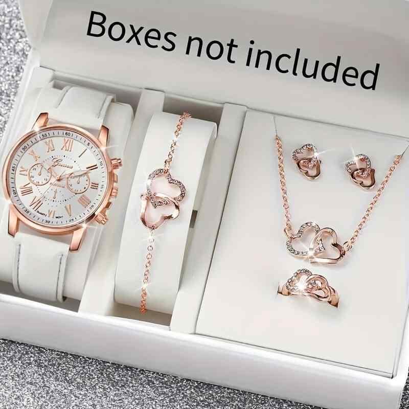 腕時計 レディース 女性用 5点セット クォーツ 3つ目文字盤 ラインストーン フェイクレザー 合金 ラウンド カジュアル ウォッチ 白