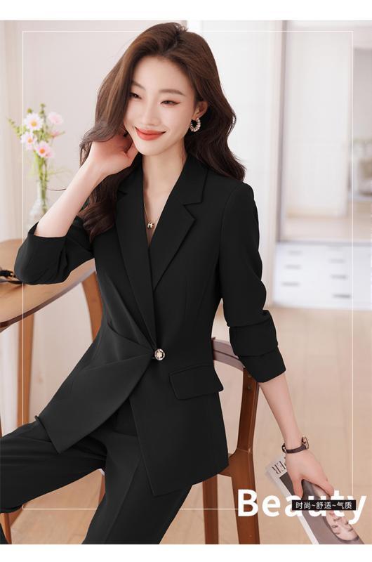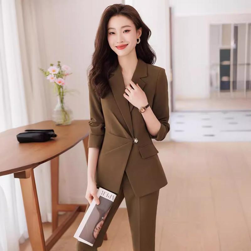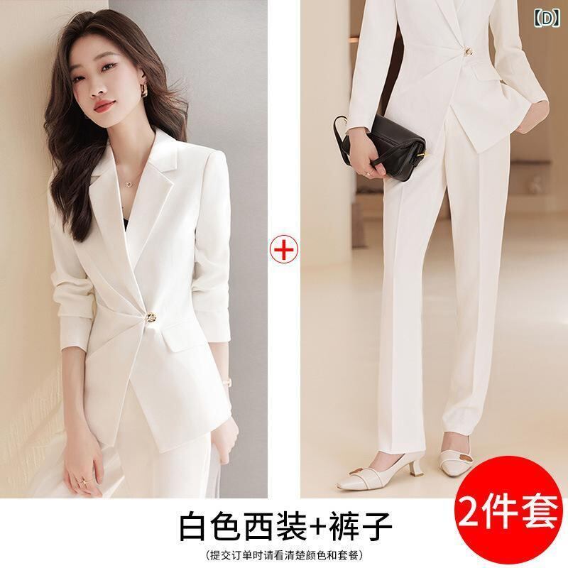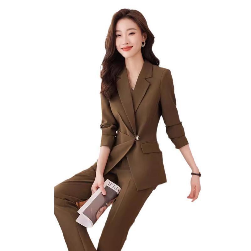 スーツ レディース 春秋 オフィス ビジネス 通勤 サロンワーク 制服 事務服 ユニフォーム 上品 エレガント きれいめ 長袖 ジャケット ロングパンツ セットアップ ポリエステル 白 黒 コーヒー色