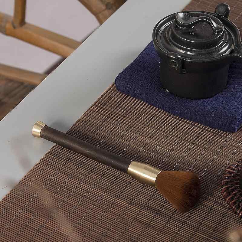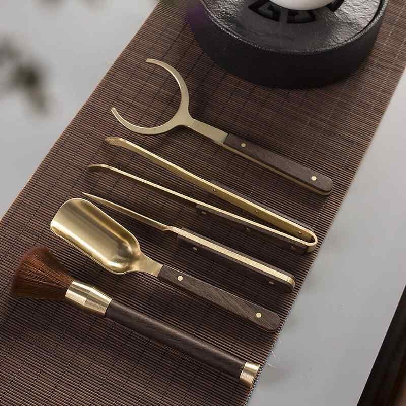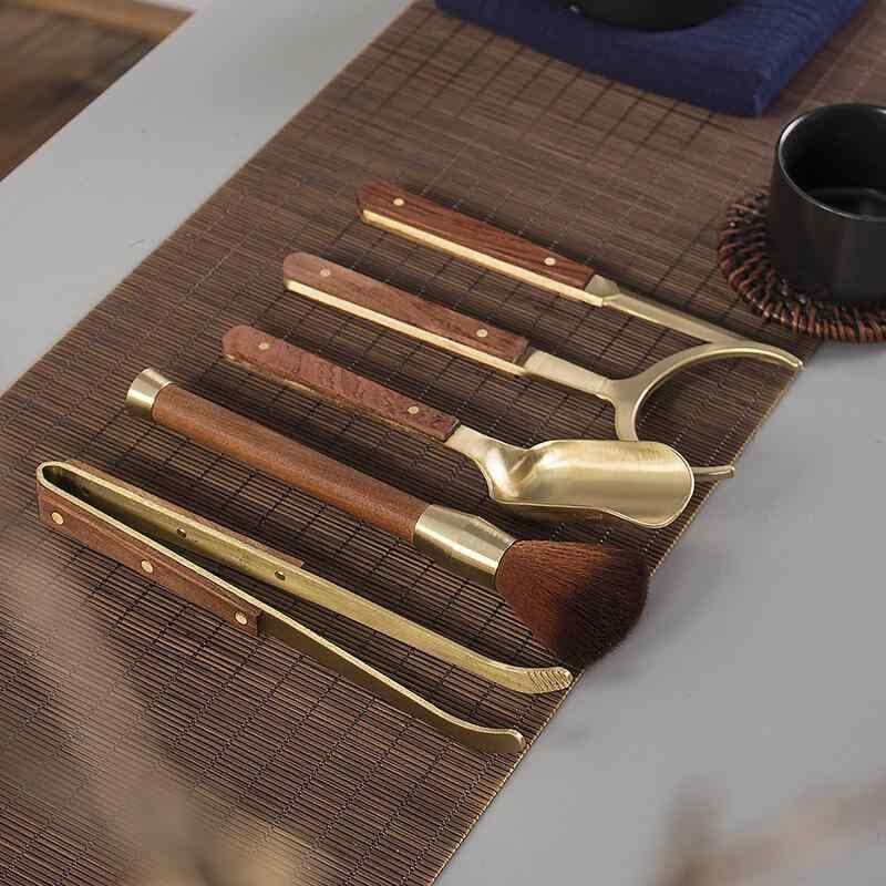 茶道具 家庭用 普段使い シンプルモダン 純銅製 天然木製 茶挟 茶ナイフ 養壺ブラシ 茶杯置き 五点組