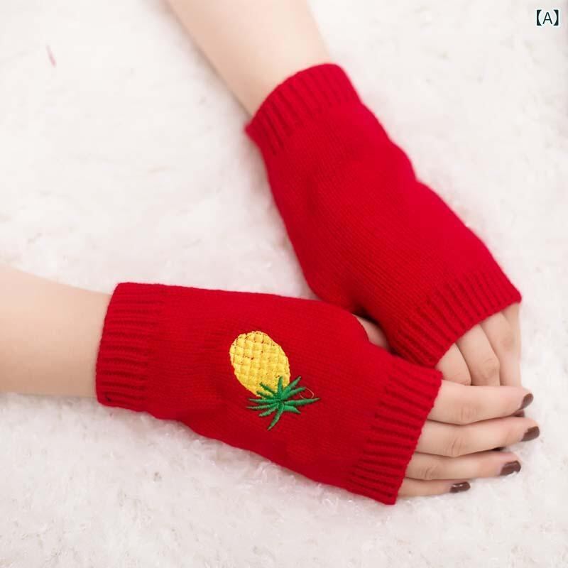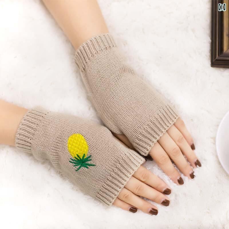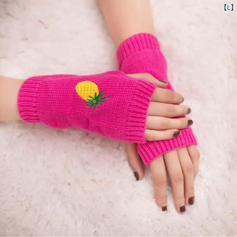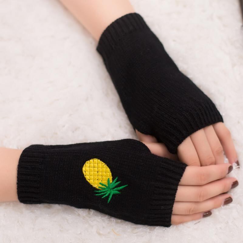 手袋 レディース 秋冬 かわいい 個性的 韓国風 刺しゅう パイナップル フルーツ カラフル 防寒 あったか アクリル ニット 指なし手袋 アームウォーマー デイリー グローブ フリーサイズ