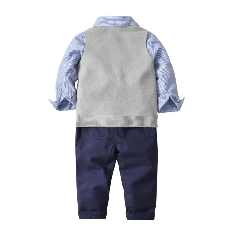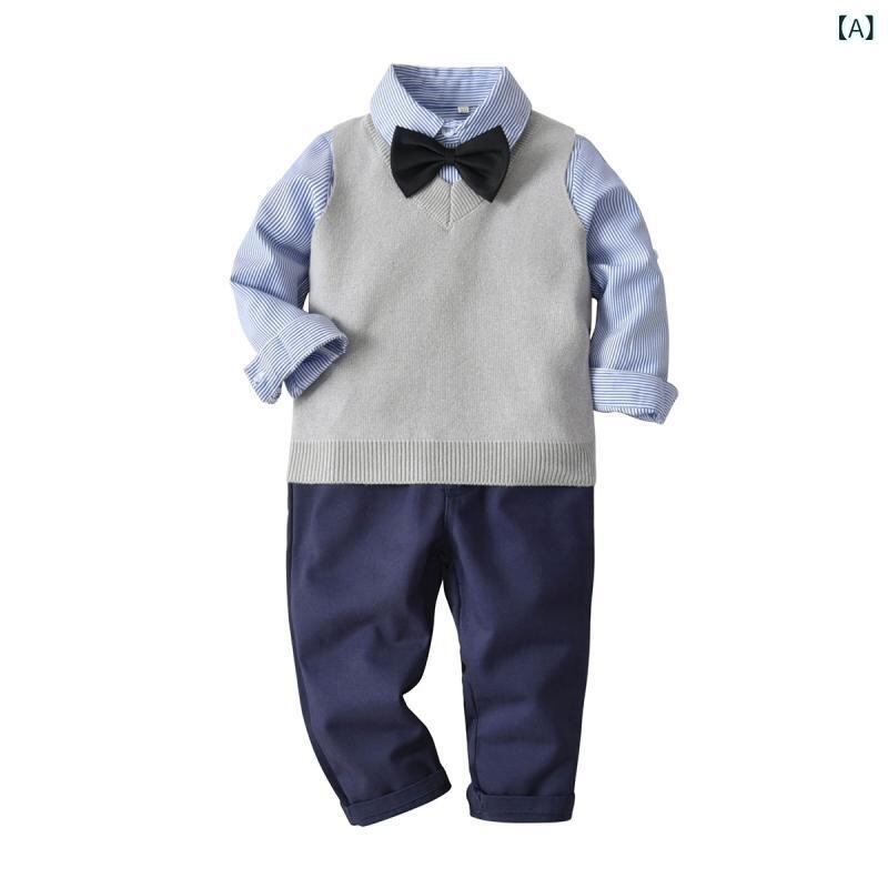 男の子用 秋冬 フォーマル セットアップ 紳士風 シャツ ニットベスト ロングパンツ 蝶ネクタイ チェック柄 綿 コットン 柔らかい肌触り 入園式 卒園式 発表会 結婚式 お呼ばれ 4点セット グレー 幼児 小学生