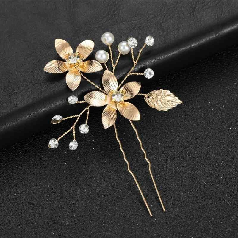 髪飾り レディース 花嫁 ブライダル ウェディング ゴールド 五弁花 フラワー リーフ U字型 かんざし ヘアピック 結婚式 披露宴 パーティー ヘッドドレス
