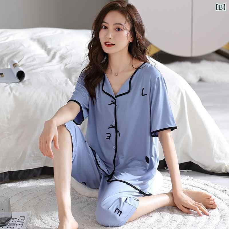 パジャマ ルームウェア レディース 女性用 春夏 夏用 モダール 薄手 涼しい Vネック 半袖 七分丈パンツ クロップドパンツ 上下セット 部屋着 寝間着 寝巻き 外着OK カジュアル 吸湿速乾 快適 リラックスウェア