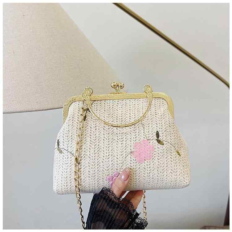 鞄 レディース 中華風刺繡 がま口 上品 エレガント シェル型 編み込み 手提げ ショルダーバッグ 斜め掛け チェーン飾り 小物入れ 漢服 チャイナドレス ピンク ホワイト 多色展開