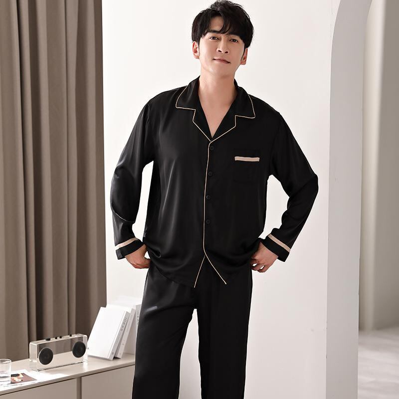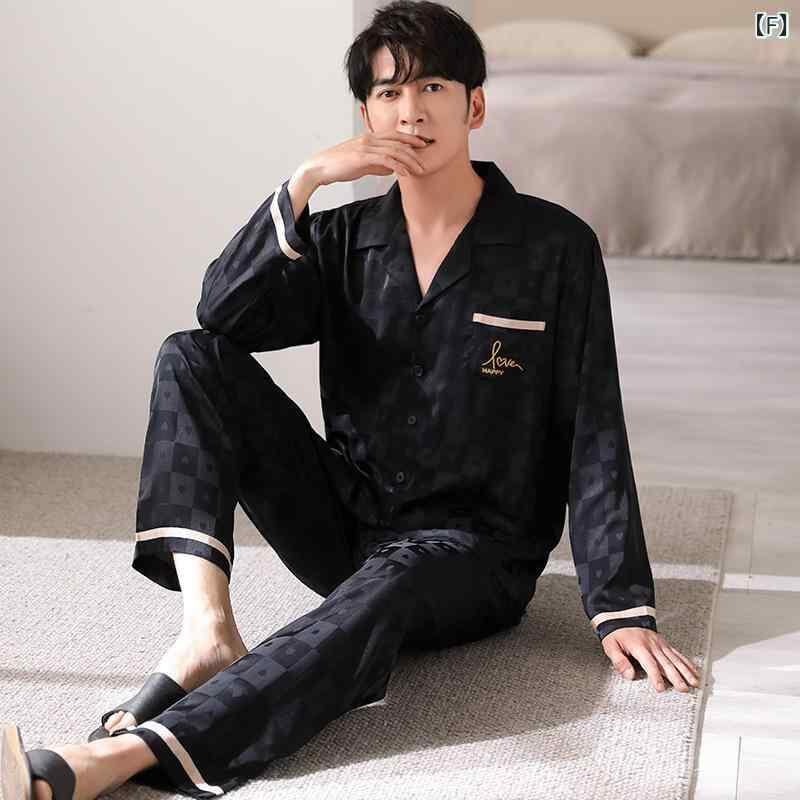 パジャマ ルームウェア メンズ 男性用 春夏 接触冷感 長袖 ロングパンツ 薄手 軽量 シルク調 高級感 開襟 襟付き 通気性 快適 外出着 上下セット ポリエステル シンプル カジュアル 部屋着 普段使い