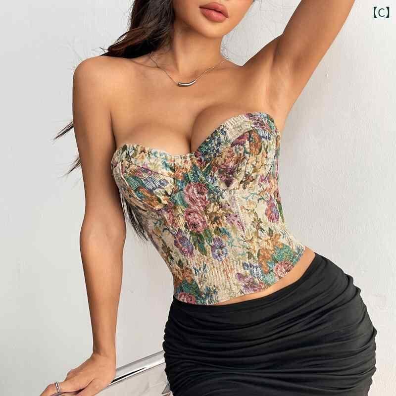 トップス レディース 欧米風 ヴィンテージ レトロ 花柄 フラワー レース ジャカード キャミソール ベアトップ ビスチェ 宮廷風 ウエストマーク コルセット風 ストラップ調節可能 リボン結び ショート丈 スリムフィット 春夏 デート パーティー
