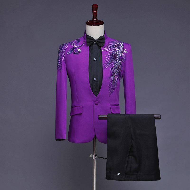 スーツ メンズ 男性用 スタンドカラー ジルコニア装飾 フェザーモチーフ 舞台衣装 発表会 演奏会 コンサート 司会 演出 パフォーマンス イベント セットアップ 上下セット 化学繊維混紡 フォーマル