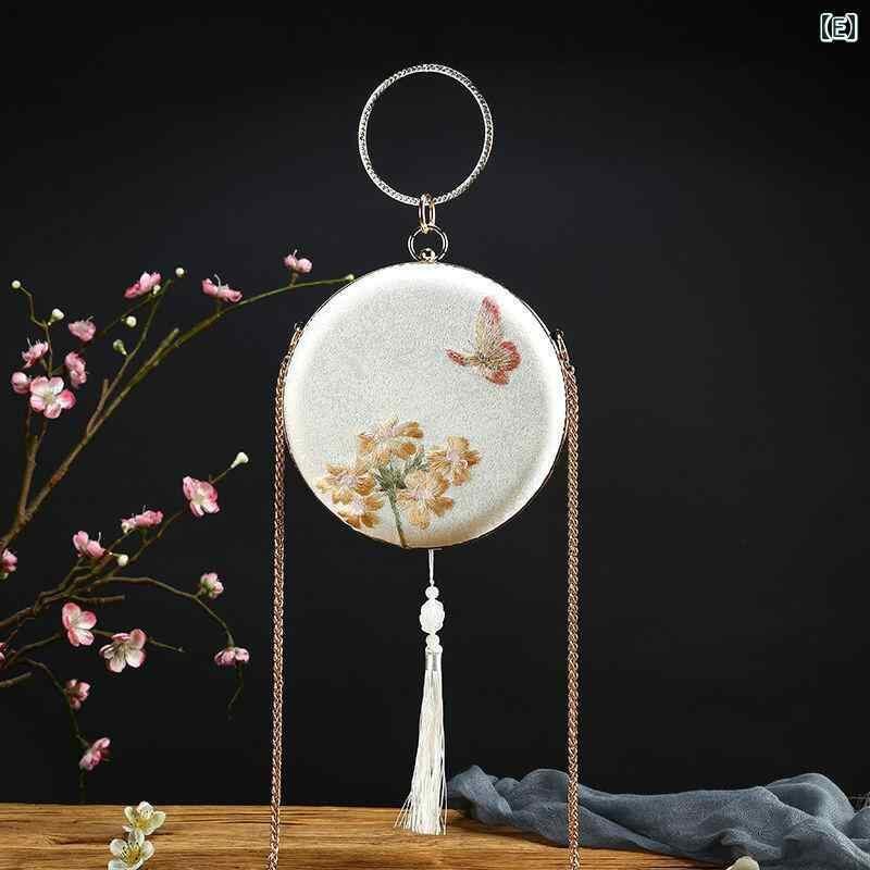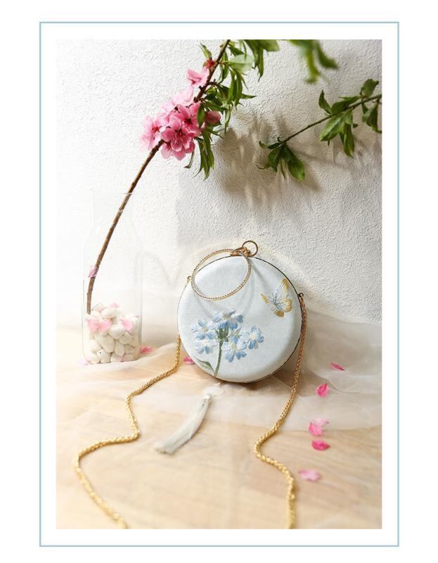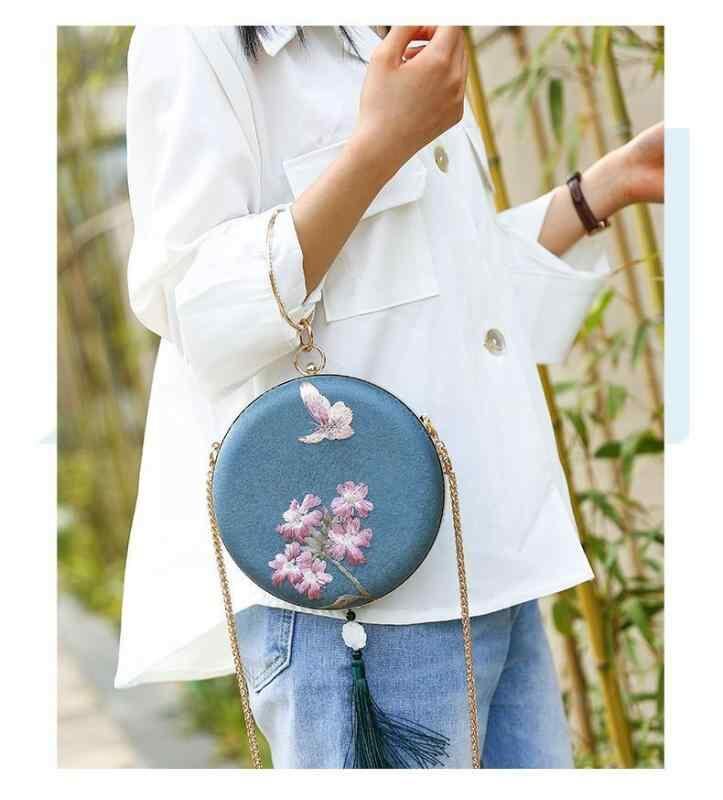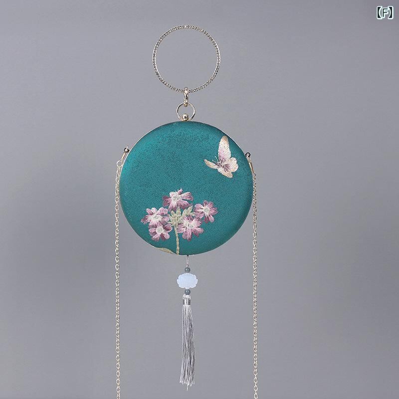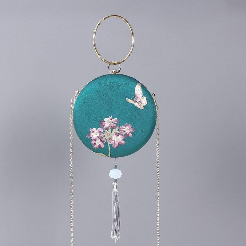 バッグ レディース 口金 ラウンド ミニ 丸型 チャイナ風 レトロ 上品 エレガント 蝶々 花 刺繍 和装 漢服 チャイナドレス 普段使い 旅行 お出かけ 春夏 綿麻 ブルー系