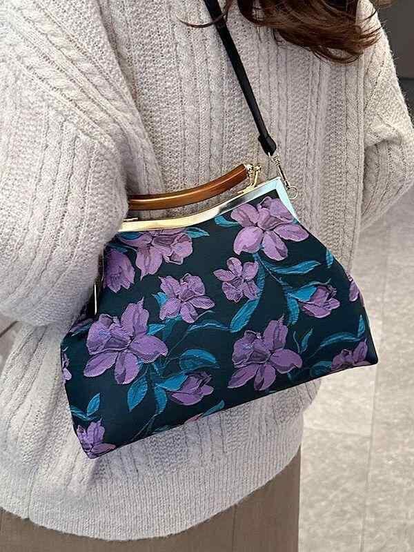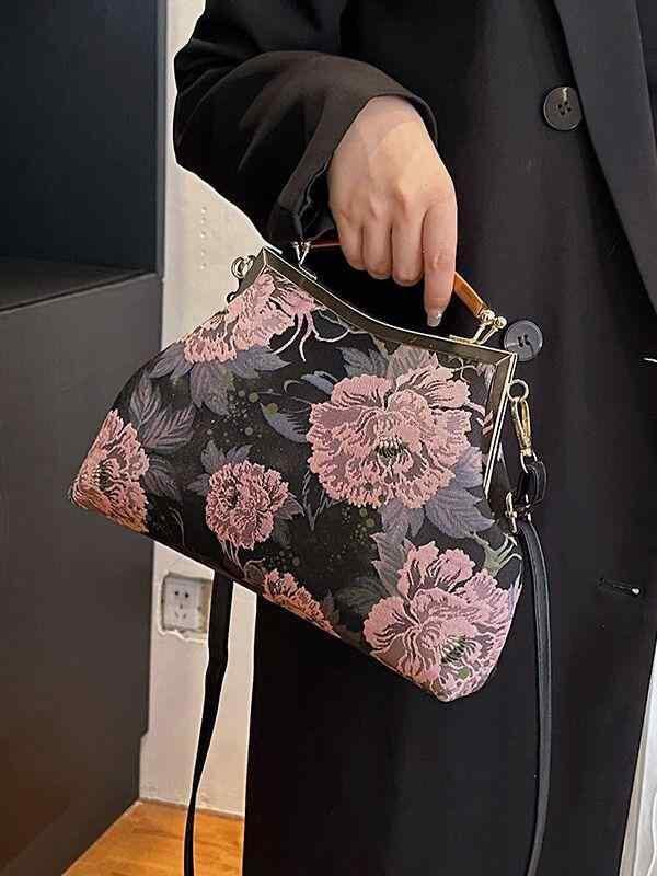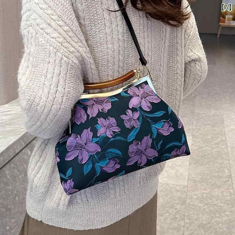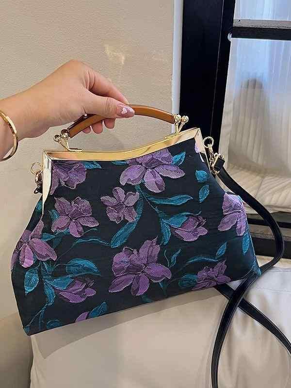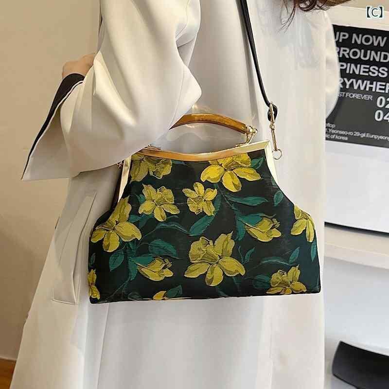 バッグ レディース 鞄 女性用 シェル型 貝殻型 ベロア プリント 花柄 チャイナドレス エレガント レトロ 口金 ハンドバッグ 手提げ鞄 ミニ 小型 普段使い