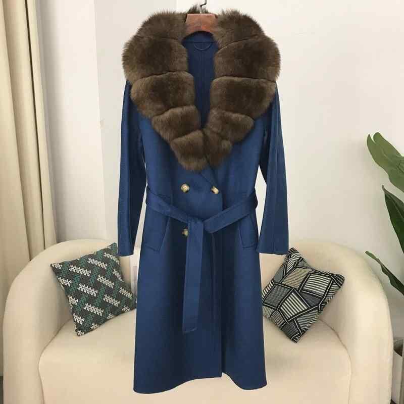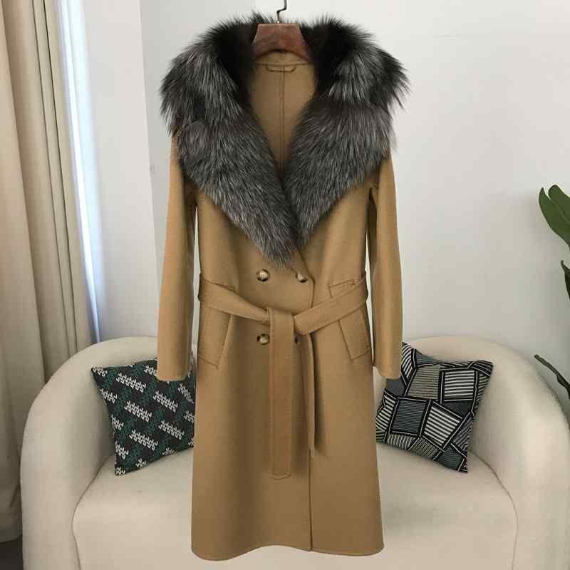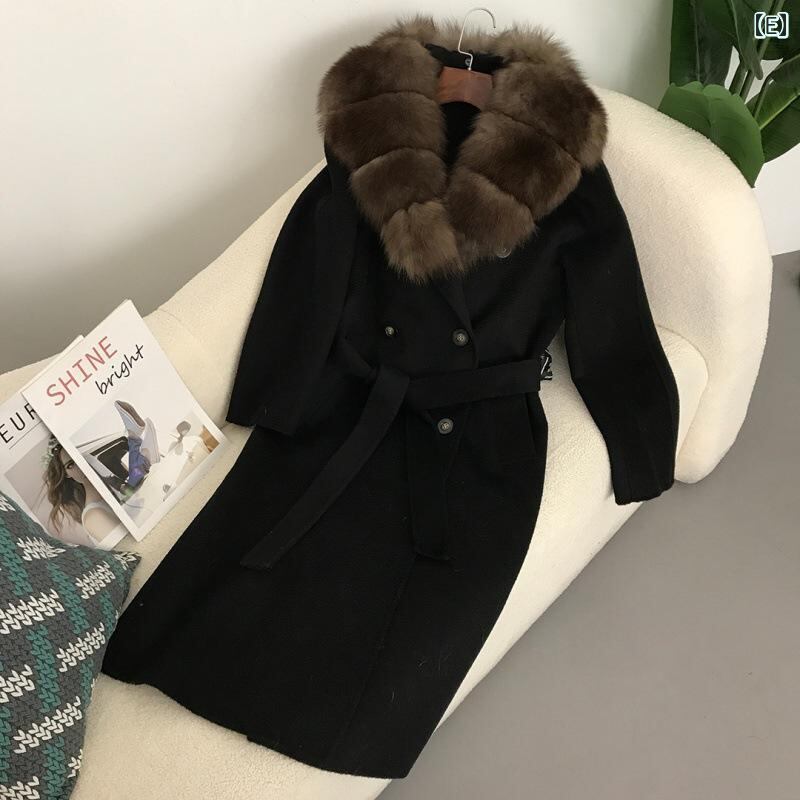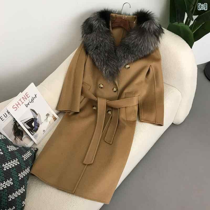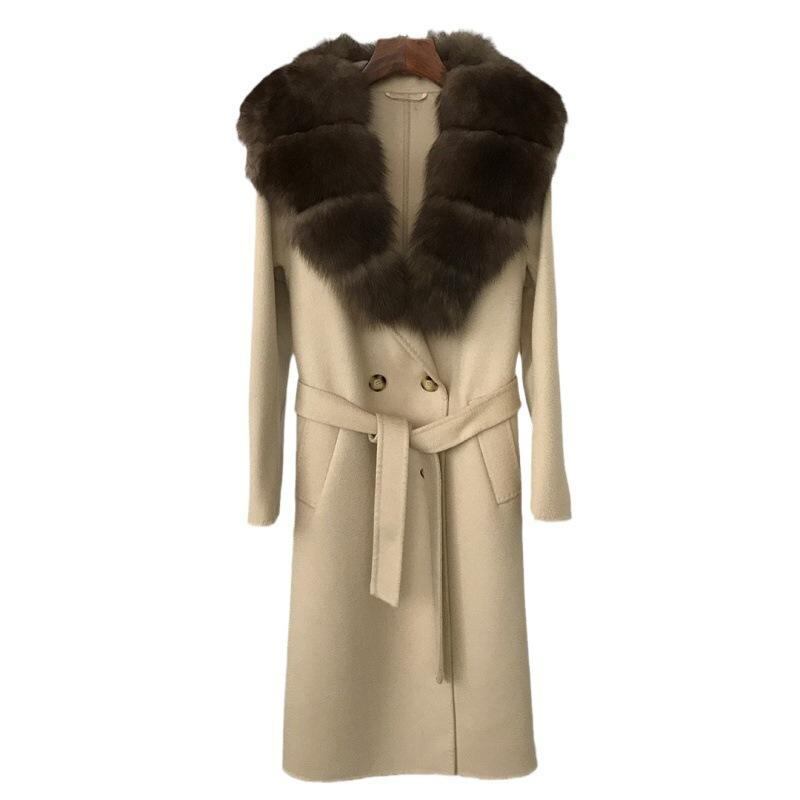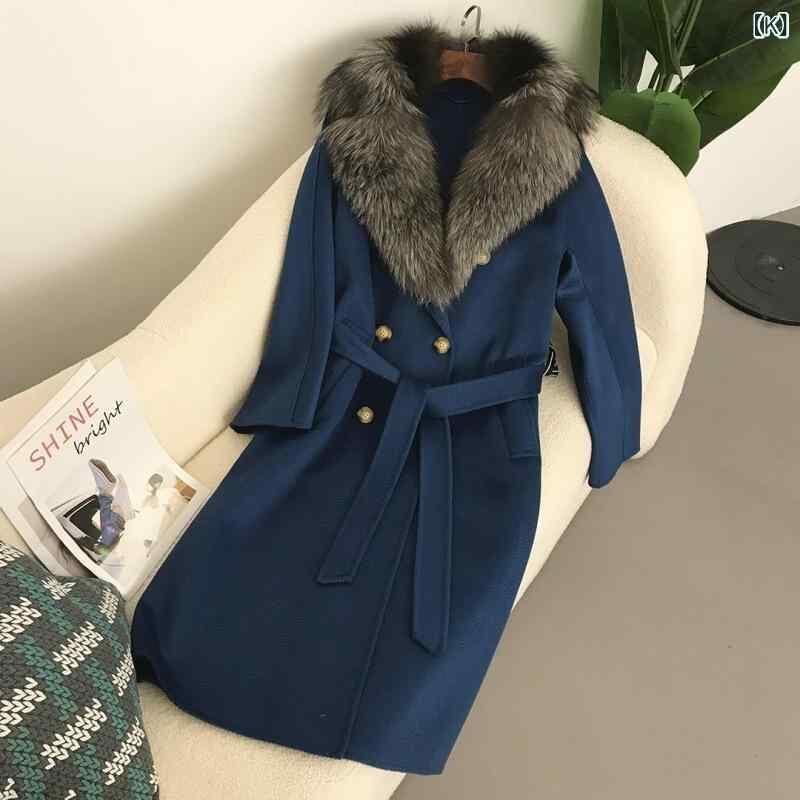 コート レディース 秋冬 ダブルフェイス ウール ロング丈 高級感 水波紋 フォックスファー襟 テーラードカラー ダブルボタン ウエストベルト ゆったり 通勤 オフィス 欧米スタイル