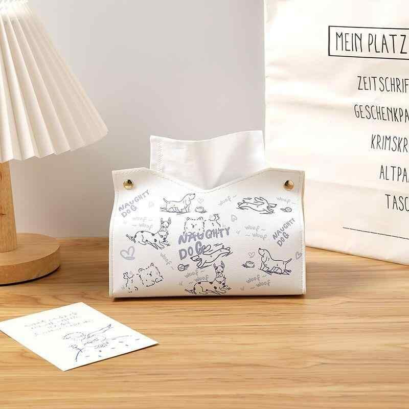 ティッシュケース 落書き風 犬柄 かわいい おしゃれ 高級感 レザー調 車載用 リビング 洗面所 バスルーム 卓上 インスタ映え 防水 多機能