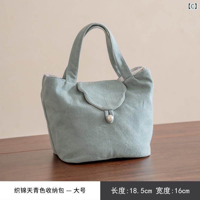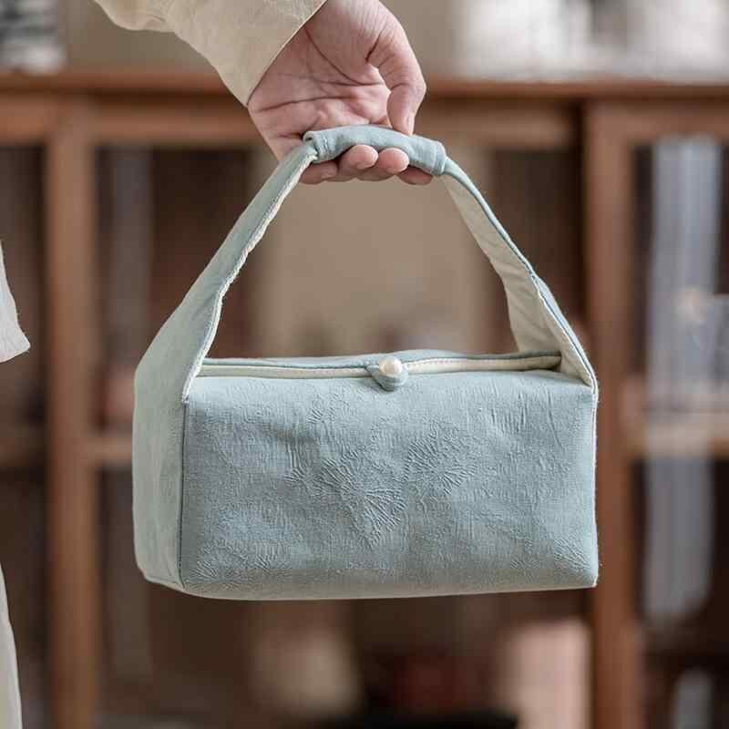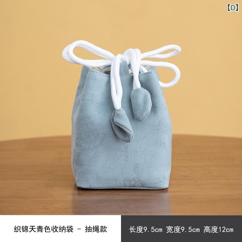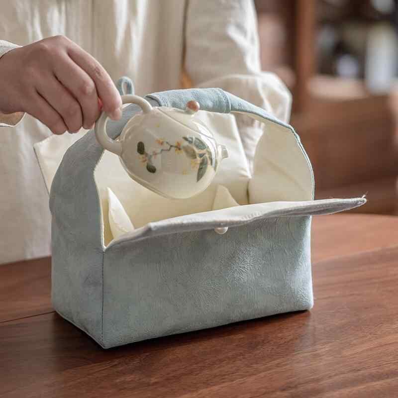 茶道具 茶器収納 収納バッグ 天青色 地紋織り 織錦 中綿入り 厚手 パールボタン 二層構造 携帯用 手提げ ポーチ 小物入れ アウトドア 和モダン 上品