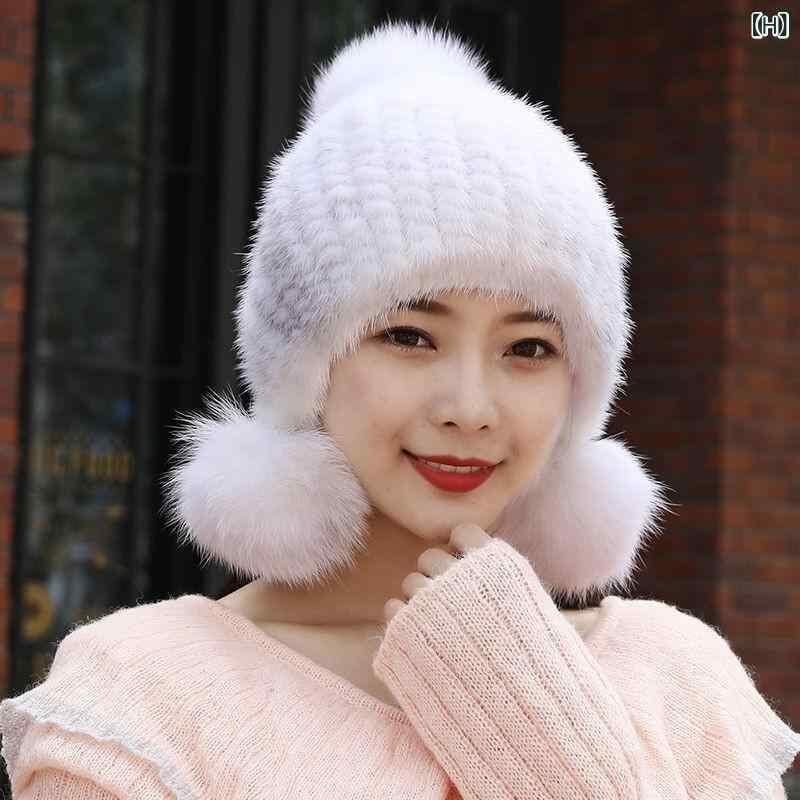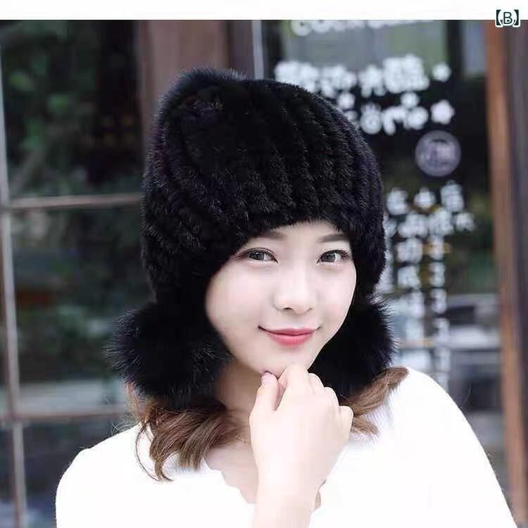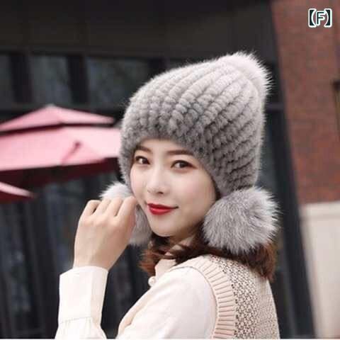 帽子 レディース ミンクファー フォックスファー ポンポン 耳あて付き 厚手 保温 編み込み かわいい 手編み 普段使い お出かけ