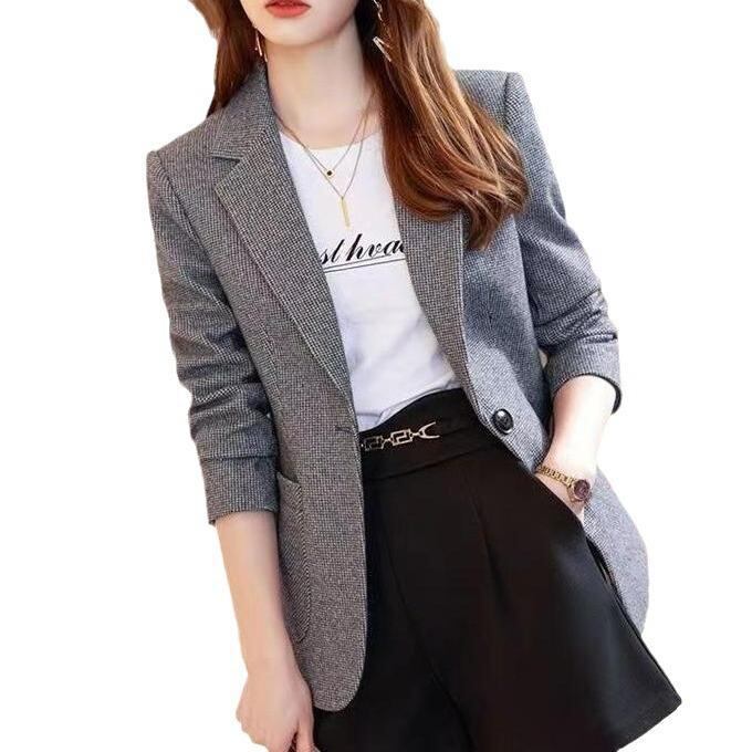 テーラードジャケット レディース チェック柄 韓国ファッション レトロ クラシカル カジュアル 通勤 オフィス きれいめ エレガント 長袖 1つボタン ポリエステル 春秋 アウター