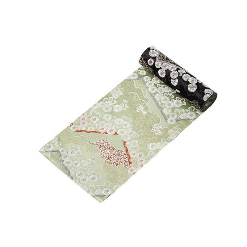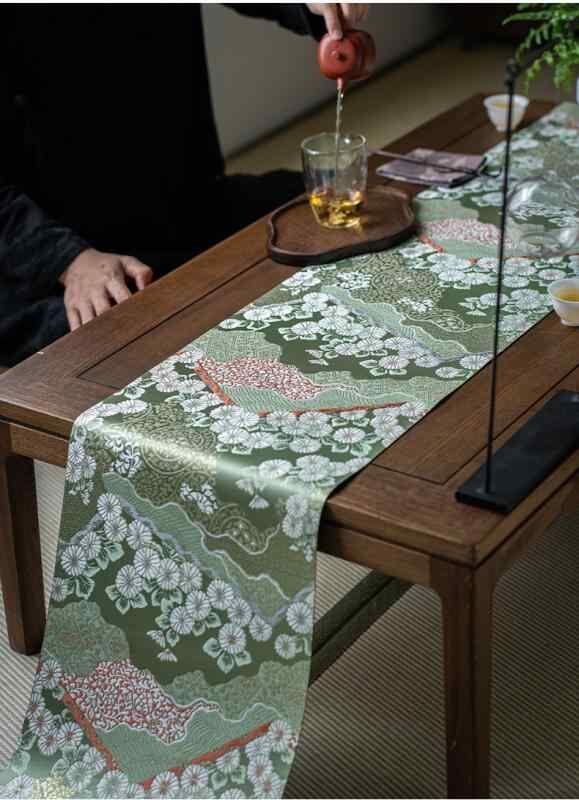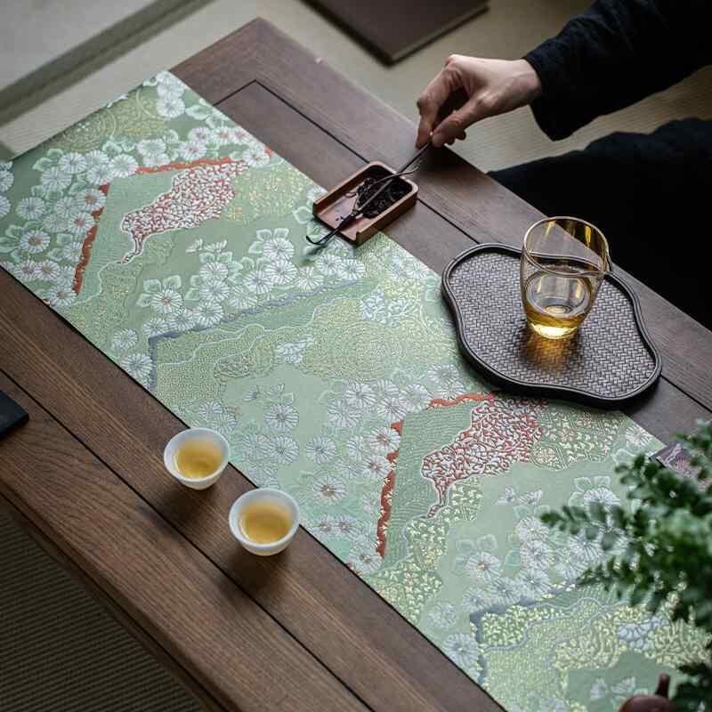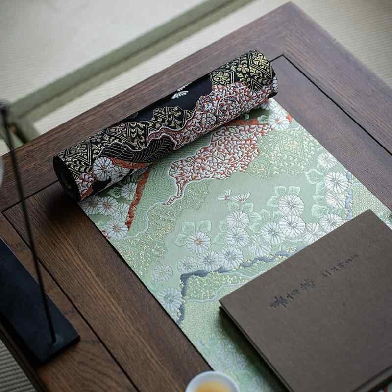 茶席 新中国風 禅モダン ミニマリスト リバーシブル 布製 西陣織 青羽金菊柄 防水加工 茶道 ティーマット テーブルランナー ランチョンマット 茶道具敷物 来客用 セット