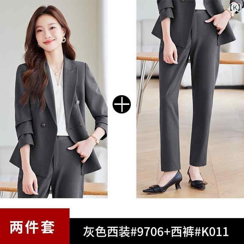 スーツ レディース 女性用 セットアップ フォーマル オフィス ビジネス 通勤 面接 高級感 エレガント 上品 小柄 グレー 長袖 ポリエステル