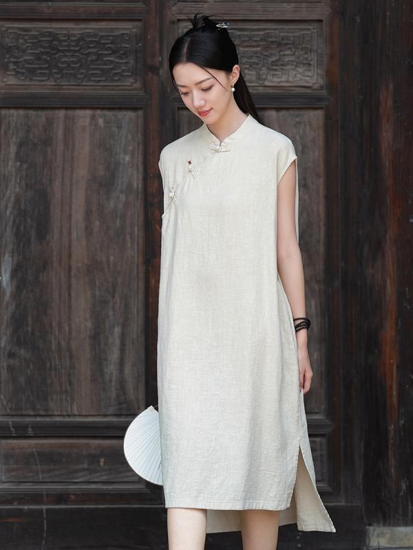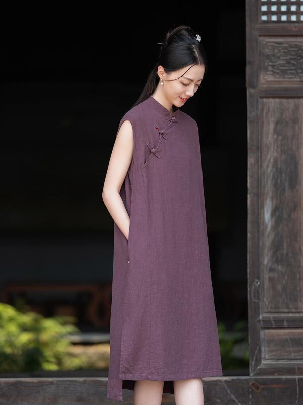 ワンピース レディース 春夏 中華風 レトロ チャイナドレス チャイナボタン 綿麻 ラミー 天然素材 砂洗い加工 スタンドカラー ノースリーブ ロング丈 普段使い リゾートファッション リネンカラー パープル